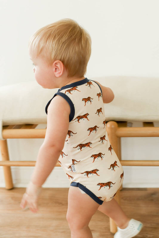Navy Tiger Bamboo Henley Onesie with Snaps