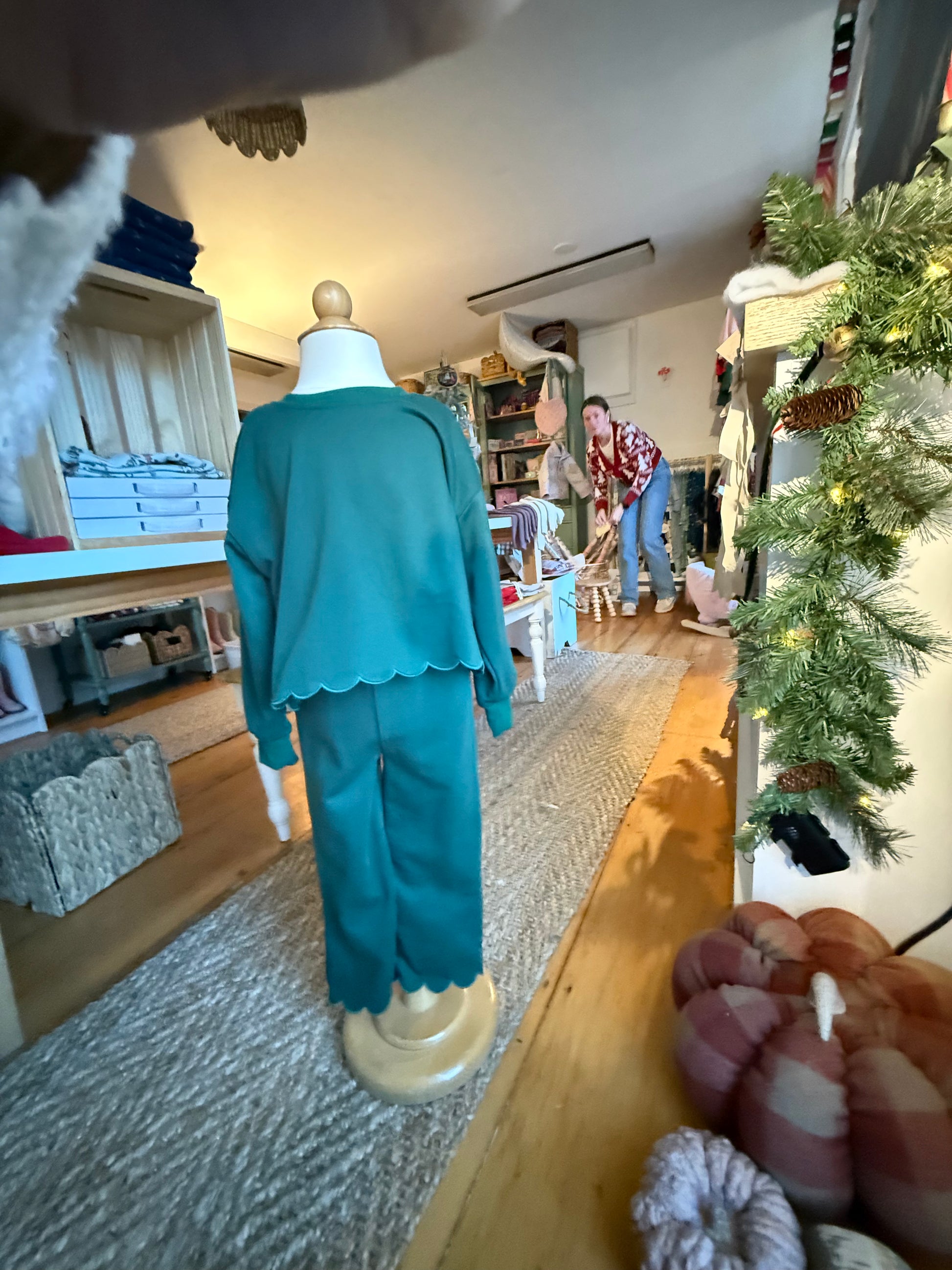 This sweet two-piece light-weight fleece set comes in classic red and pine green. Perfect scalloped detail for a little flair while keeping them warm, and the pants even have pockets! This is a cotton blend for minimal shrinkage, just like their favorite sweatshirt.